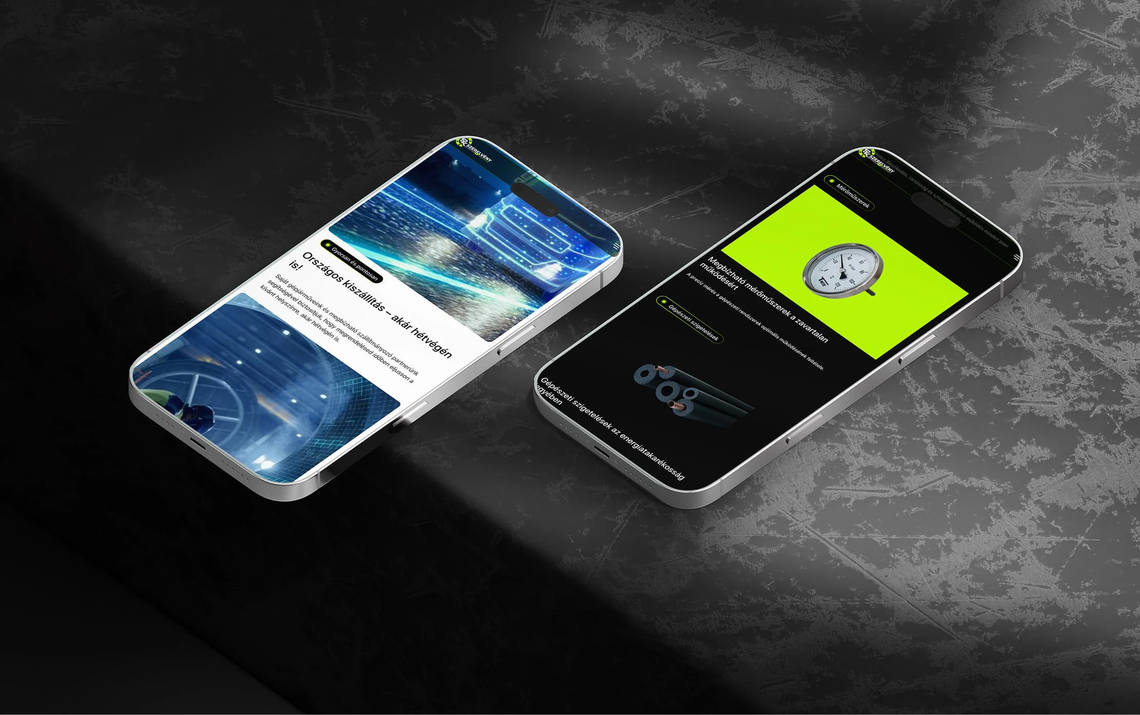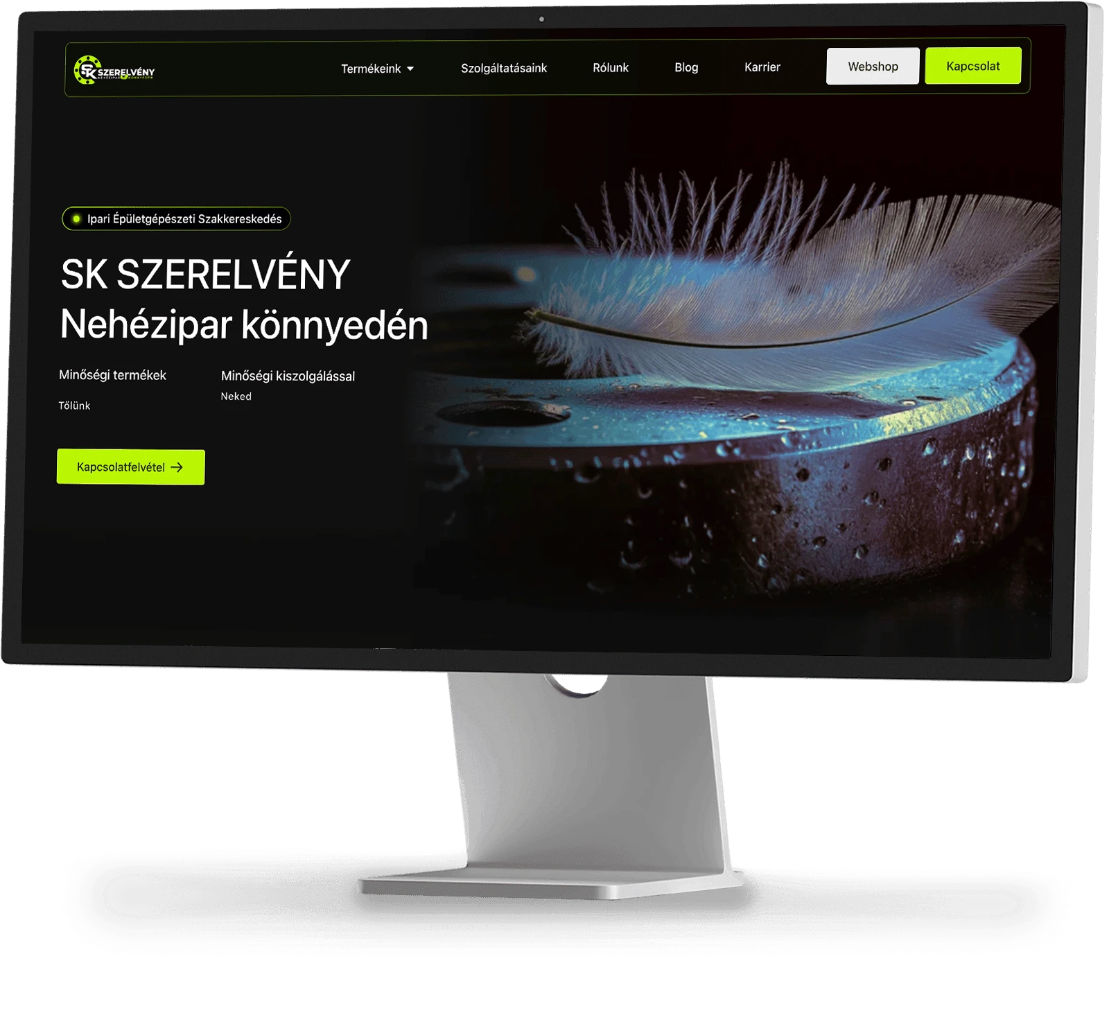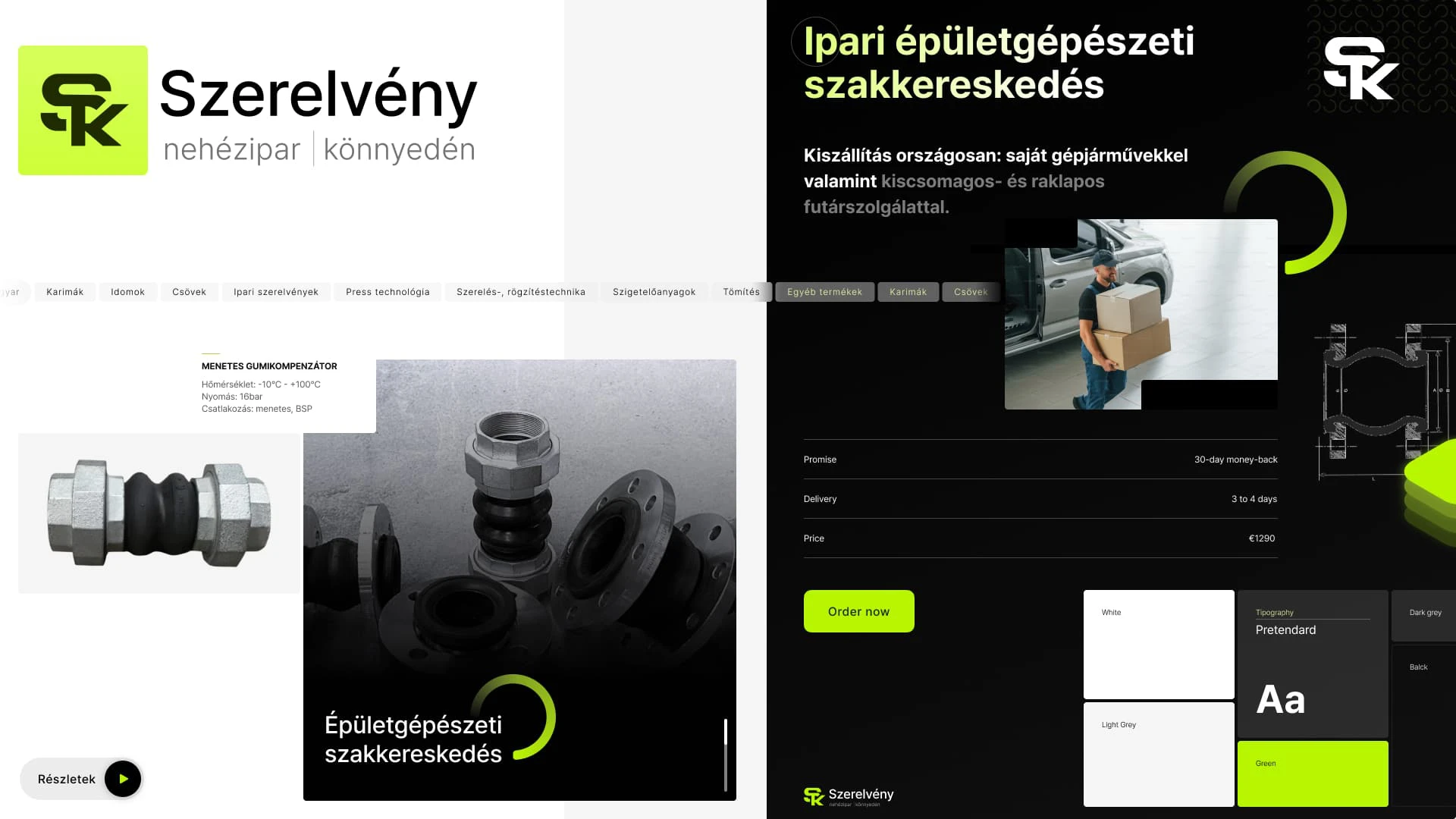 The second phase focused on visual direction. Since S-K Szer operates in the industrial sector, it was essential to keep the design professional and robust rather than decorative — but still modern and distinctive. We paired a black-and-chrome base with the company’s signature vivid green, giving the site a sharp, innovative, and precise feel.